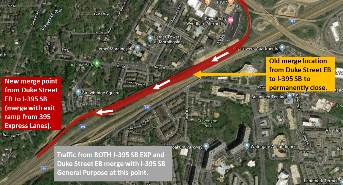 Motorists also are advised that the ramp from eastbound Duke Street to southbound I-395 has been extended, resulting in a new merge point. The ramp will depart from eastbound Duke Street at its existing location, but instead of immediately merging with the southbound I-395 general purpose lanes, will extend and merge with traffic exiting from the southbound I-395 Express Lanes. Traffic then will merge onto the southbound I-395 general purpose lanes. Drivers coming from eastbound Duke Street should yield to southbound Express Lanes traffic.