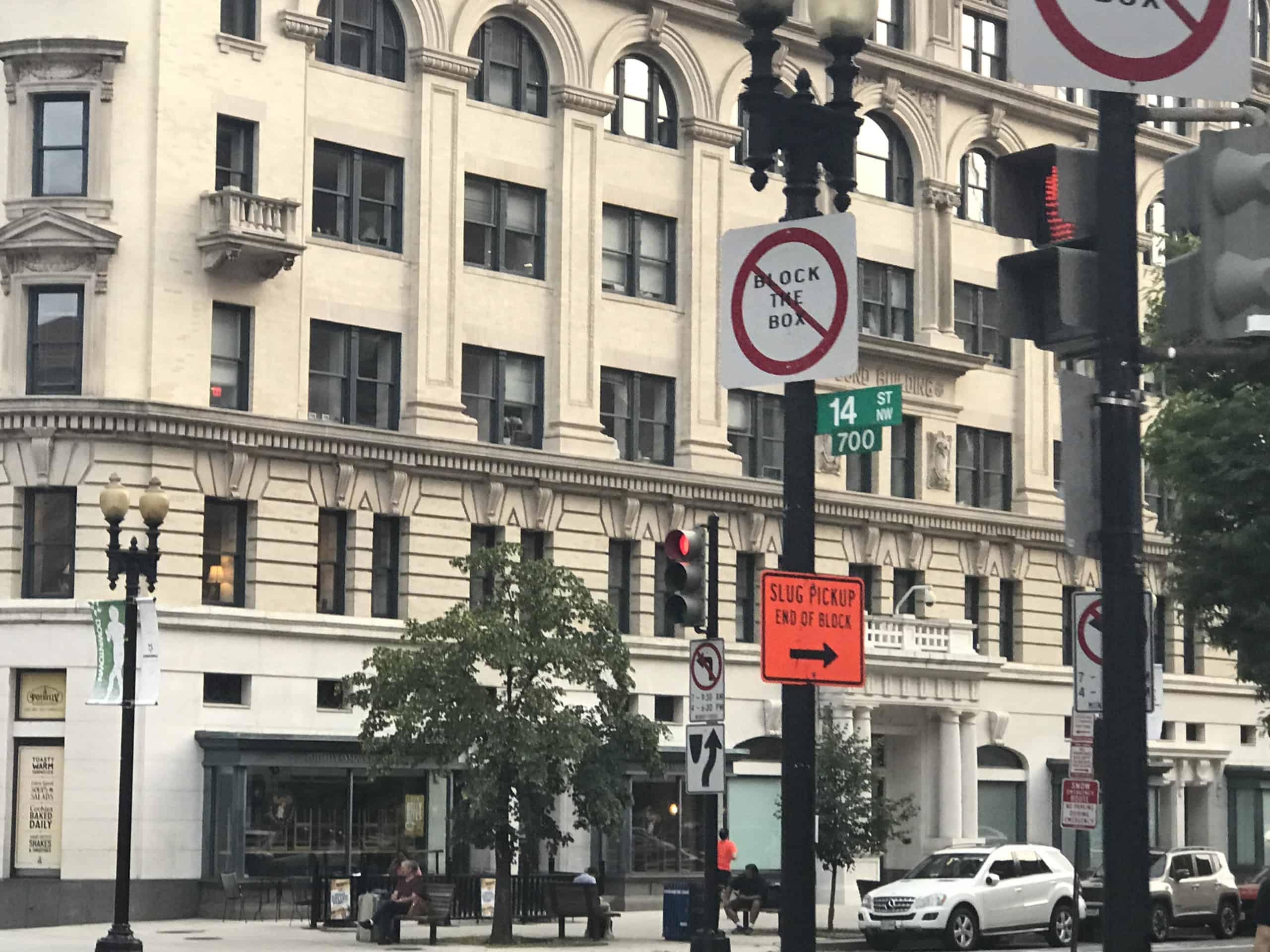 District Department of Transportation installed Slug Pickup Signs in 2011 on 14th and New York Avenue NW
